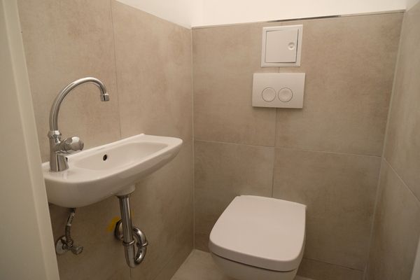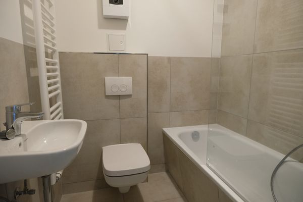 Das Badezimmer ist mit einer Badewanne ausgestattet und lädt zu entspannten Momenten nach einem langen Tag ein. Zusätzlichen Komfort bietet der gemeinschaftliche Waschmaschinenraum, der den Alltag praktisch und unkompliziert gestaltet.