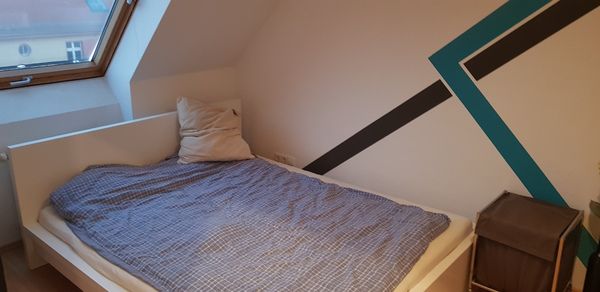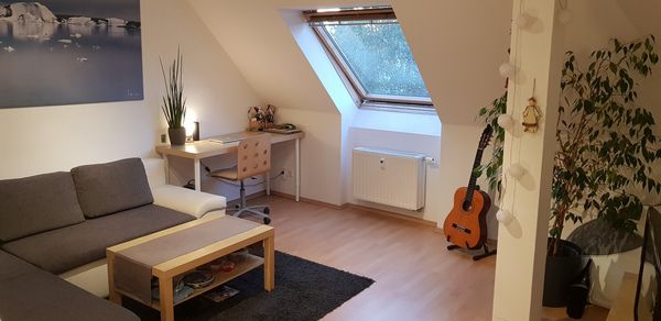 Auf ca. 42 m² Wohnfläche befinden sich zwei Zimmer, eine separate Küche und ein modernes Tageslichtbad. Der Boden in den Wohnräumen ist mit hellem Laminat ausgelegt. Das Bad sowie die Küche sind gefliest. Das Tageslichtbad verfügt über eine Dusche mit Verglasung und die sanitären Leitungen sind unterputz. Die Dachschrägen, welche die gesamte Wohnung zieren, versprühen einen besonderen Charme.