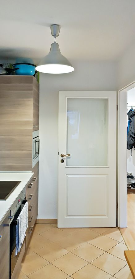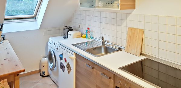 Es gibt ebenfalls eine Einbauküche inkl. Elektrogeräte (Einbauherd mit Cerankochfeld, Einbaumikrowelle, kleiner Kühlschrank mit Gefrierfach).